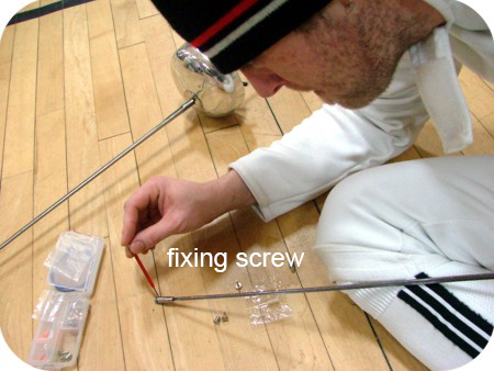 The sport of fencing has outdated equipment and numerous pain points for athletes. One of the biggest problems is a small set screw used in the captivation of a push button on the end of the weapon. This screw is susceptible to falling out which can cause a fencer to loose 1 point out of 5.